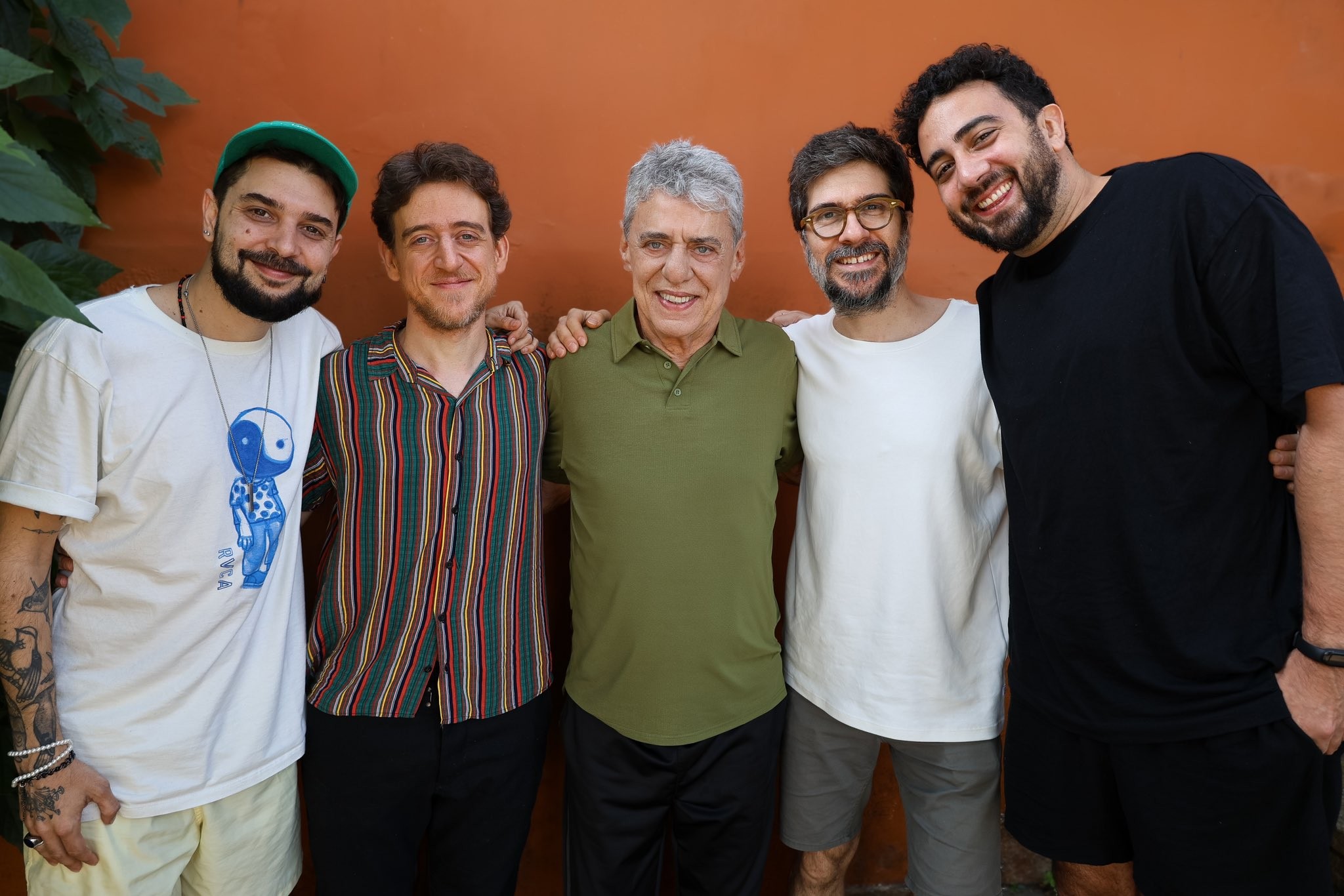 ♪ Postada nas redes sociais do grupo 5 a Seco na manhã deste sábado, 16 de novembro, a foto acima flagra Chico Buarque (ao centro) com Pedro Altério (à esquerda), Vinicius Calderoni (de camisa listrada), Tó Brandileone (de óculos) e Pedro Viáfora (à direita).