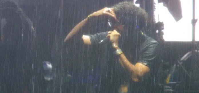 Às 19h10, toda cidade entrou em estado de atenção para alagamentos. As próximas horas, seguem com tempo instável, segundo o CGE. Criolo canta embaixo de chuva forte