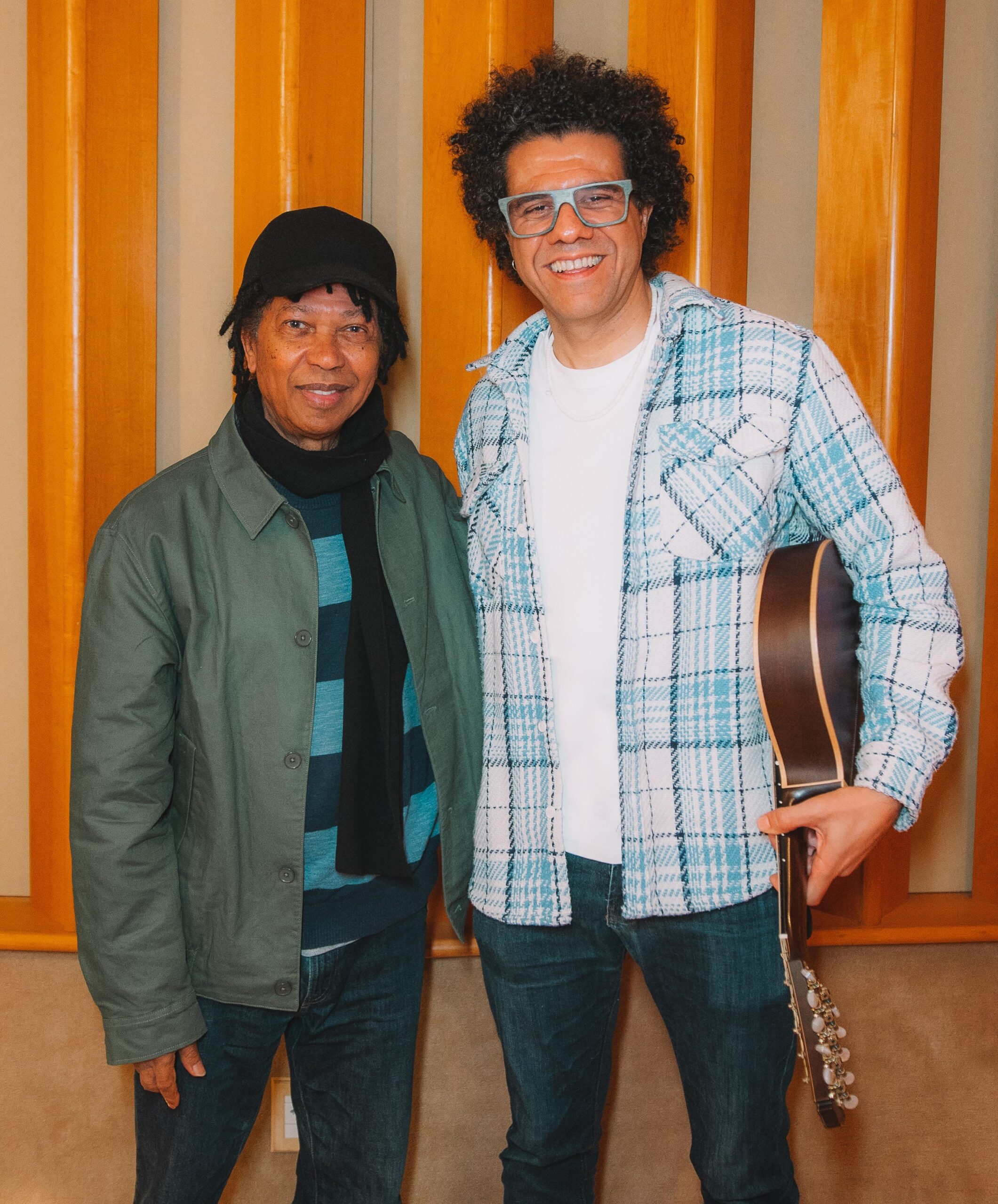 Hamilton de Holanda (à esquerda) posa com Djavan no estúdio na gravação das faixas ‘Luz’ e ‘Lambada de serpente’