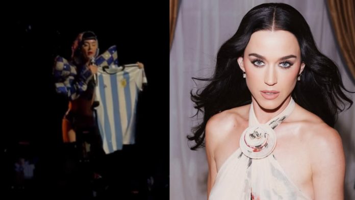 Katy Perry se apresentou em Buenos Aires nesta quarta (9) e cantou um trecho de “Don’t Cry for Me Argentina”, do musical “Evita”. Durante o show, ela também levantou uma camisa da seleção argentina, jogada no palco por fãs.